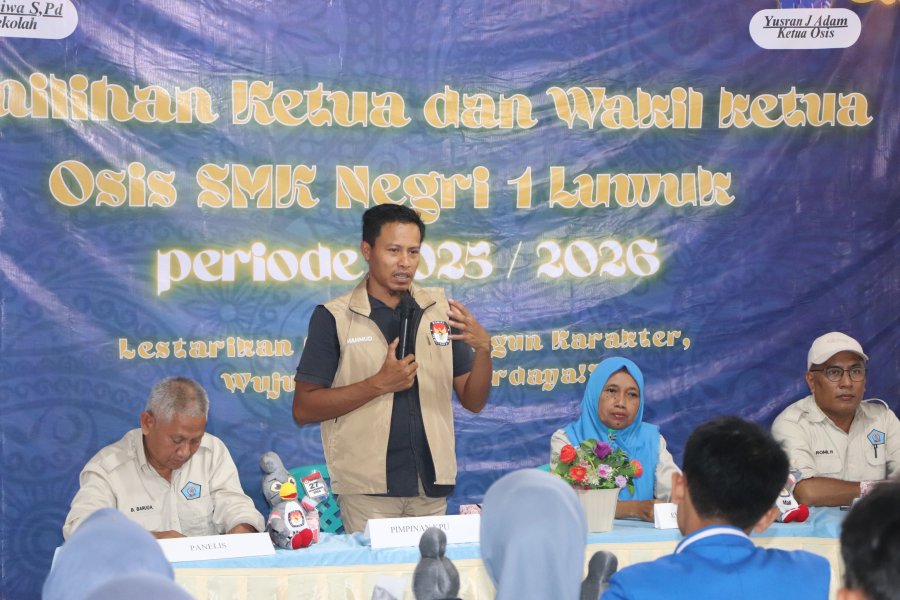 Luwuk, kab-banggai.kpu.go.id - KPU Kabupaten Banggai menghadiri Undangan Sosialisasi dan Pendidikan Pemilih yang diselenggarakan oleh SMKN 1 Luwuk, Sabtu (8/11/2025). Kegiatan ini bertujuan untuk memberikan pemahaman kepada para pelajar, khususnya pemilih pemula, tentang pentingnya partisipasi aktif dalam proses demokrasi dan pemilihan umum. Hadir dalam kegiatan tersebut Anggota KPU Kabupaten Banggai, Mahmud selaku Ketua Divisi Sosialiasi Pendidikan Pemilih, Partisipasi Masyarakat dan SDM dan Jajaran Sekretariat, Kepala SMKN 1 Luwuk Evriaty Mahiwa, S.Pd beserta jajaran serta siswa-siswi peserta sosialisasi. Dalam sambutannya, Anggota KPU Banggai menyampaikan apresiasi kepada pihak sekolah atas inisiatif menyelenggarakan kegiatan pendidikan pemilih. “Pemilih pemula memiliki peran penting dalam menentukan arah masa depan bangsa. Melalui kegiatan seperti ini, kami berharap para siswa dapat memahami hak dan tanggung jawabnya sebagai warga negara dalam menggunakan hak pilih secara cerdas dan bertanggung jawab,” ujar Mahmud. Sosialisasi ini juga membahas berbagai aspek kepemiluan, mulai dari tahapan pemilu, pentingnya daftar pemilih, hingga etika dalam menggunakan media sosial menjelang pemilu. Para siswa tampak antusias mengikuti sesi tanya jawab dan diskusi yang berlangsung interaktif. Kepala SMKN 1 Luwuk menyampaikan terima kasih atas kehadiran dan dukungan KPU Kabupaten Banggai dalam memberikan edukasi politik bagi siswa. “Kami berharap kegiatan seperti ini dapat rutin dilakukan agar siswa memiliki kesadaran pemilih pemula yang baik sejak dini,” ujarnya. Kegiatan ditutup dengan sesi foto bersama antara KPU Kabupaten Banggai dan pihak sekolah, sebagai simbol komitmen bersama dalam membangun generasi muda yang melek demokrasi dan siap berpartisipasi dalam pemilu. (humas KPU Banggai Nurul/foto: Nofry/editor :Mahmud) ....