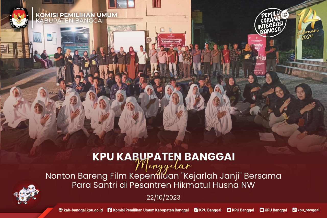 Luwuk, kab-banggai.kpu.go.id, Memperingati hari Santri Nasional Tahun 2023 Komisi Pemilihan Umum (KPU) Kabupaten Banggai melaksanakan program serentak Goes to Pesantren dengan menggelar Nonton Bareng Film Kejarlah Janji di Pondok Pesantren Hikmatul Khusna NW bertempat di Kecamatan Toili, Minggu (22/10/2023).