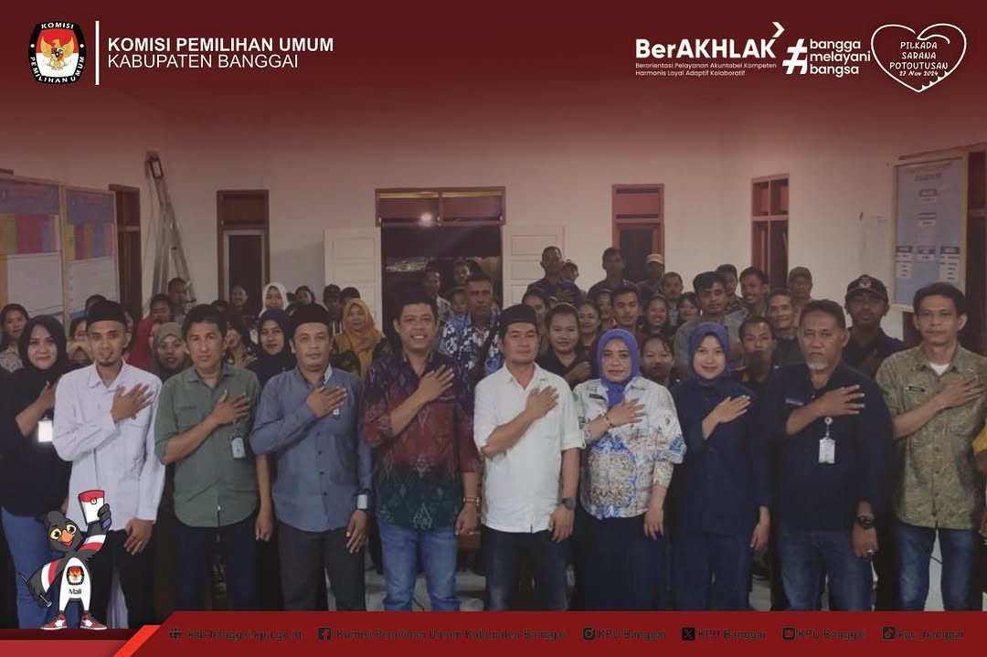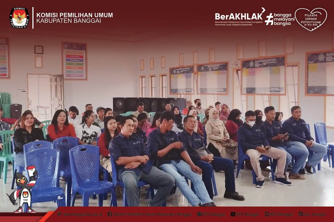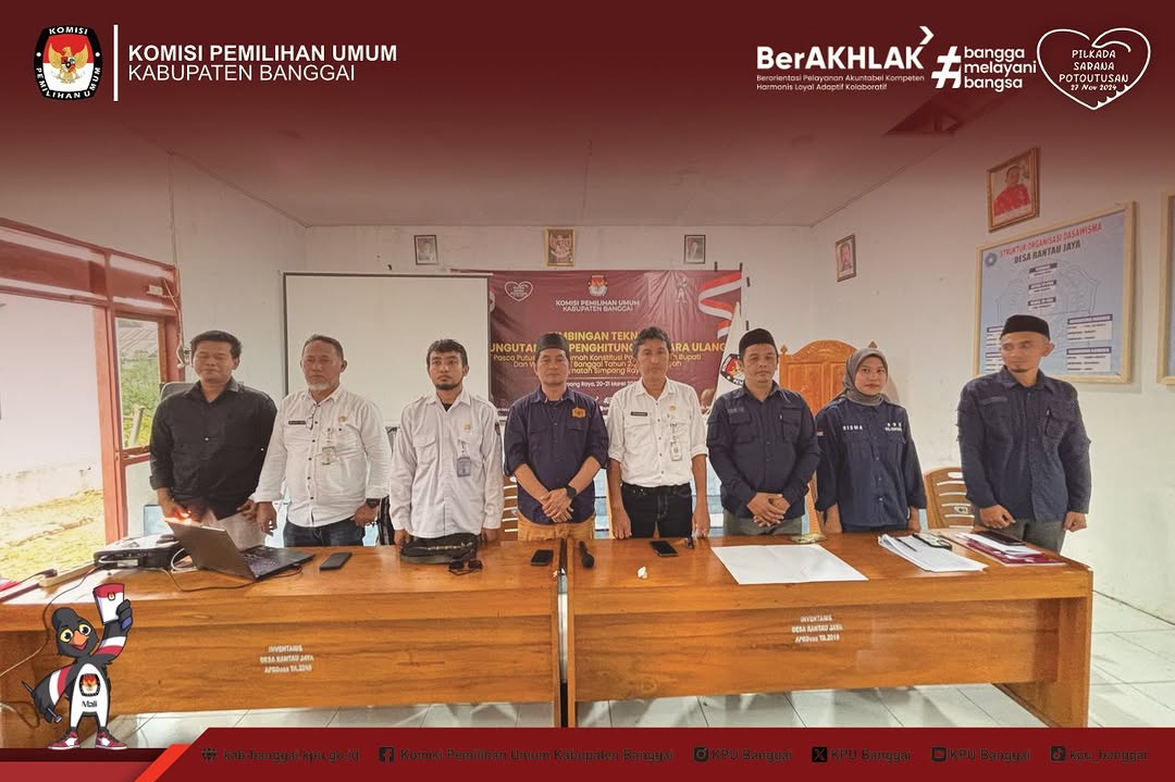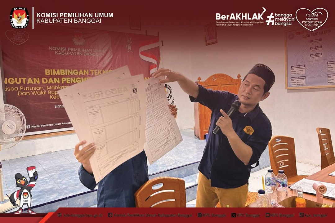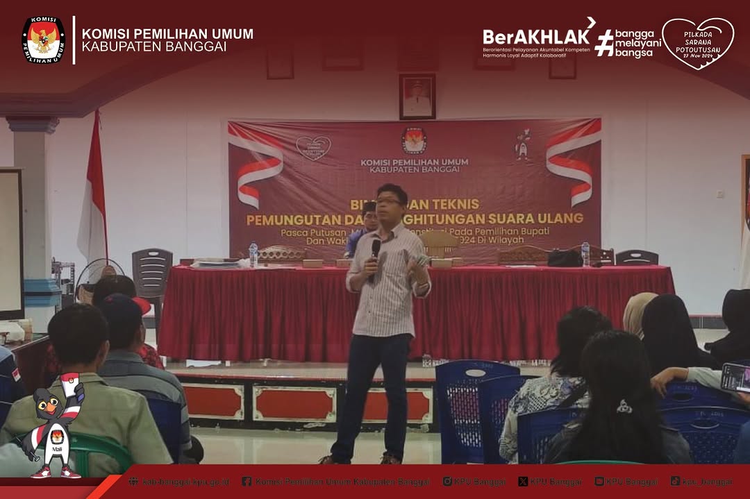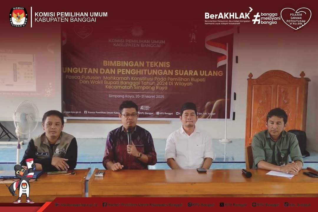 KPU Kabupaten Banggai melaksanakan Kegiatan Bimbingan Teknis Pemungutan Suara dan Penghitungan Suara Ulang Pasca Putusan Mahkamah Konstitusi Republik Indonesia pada Pemilihan Bupati dan Wakil Bupati Kabupaten Banggai Tahun 2024 di wilayah Kecamatan Toili dan Simpang Raya.