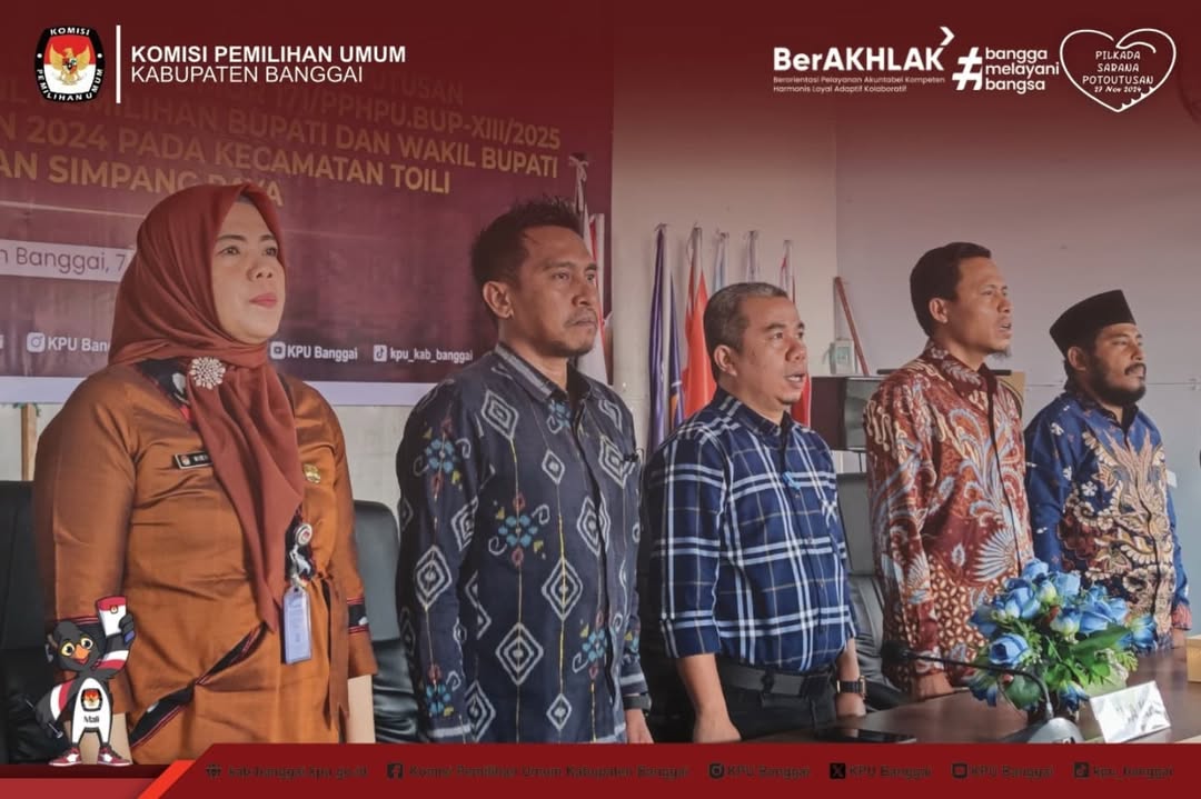pada Kecamatan Toili dan Kecamatan Simpang Raya, kegiatan ini dilaksanakan pada hari Jumat tanggal 7 Maret 2025 bertempat di Aula Kantor KPU Kabupaten Banggai, untuk peserta kegiatan yaitu dari Forkopimda yang terdiri dari Polres Banggai, Dandim 1308 Luwuk Banggai, Kepala Kejaksaan Negeri Luwuk, Akademisi, Organisasi Kepemudaan, Organisasi Kemasyarakatan, Partai Politik, Media Cetak dan Media Online.