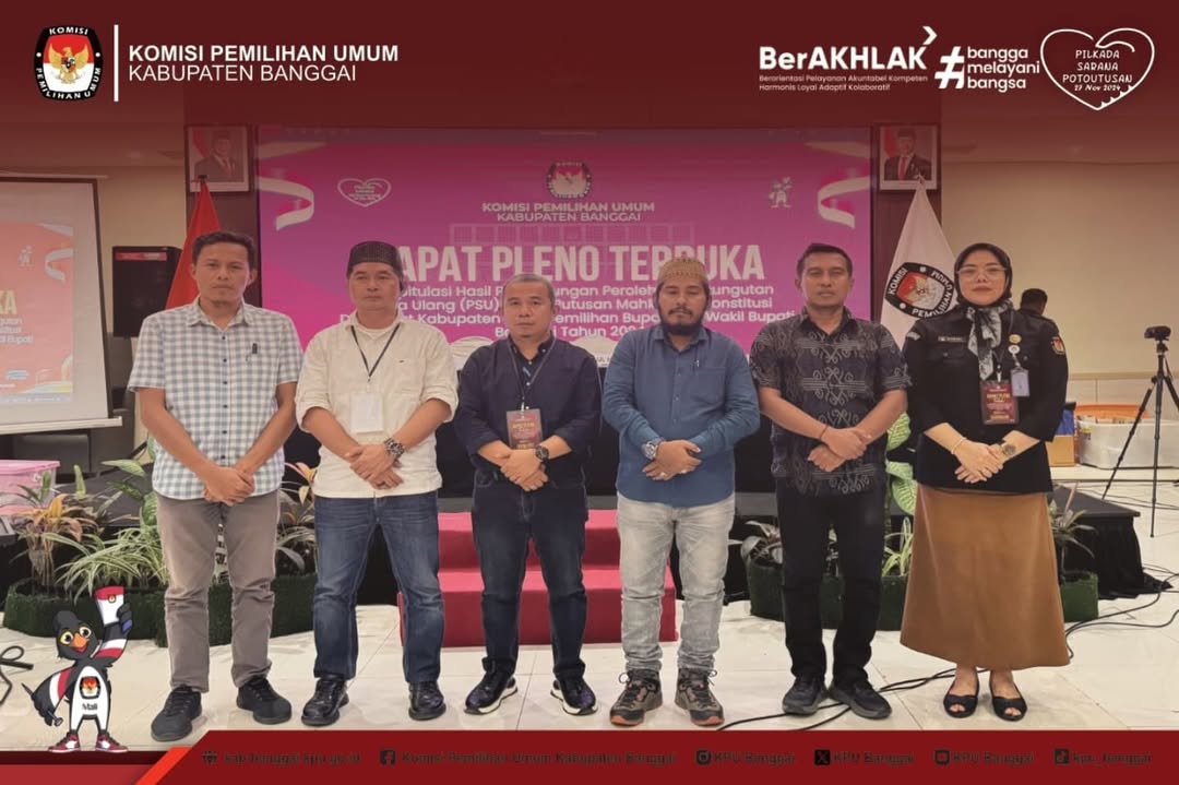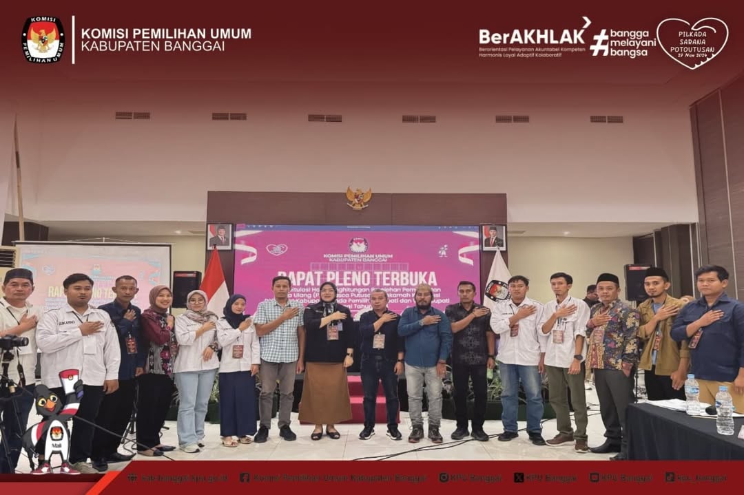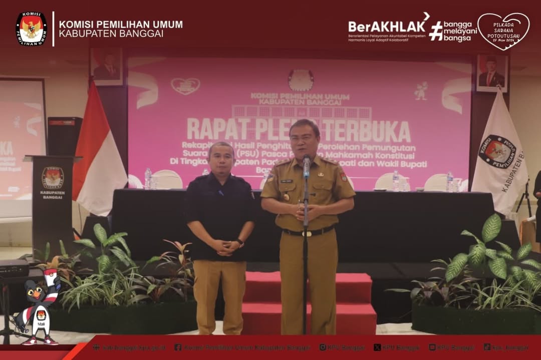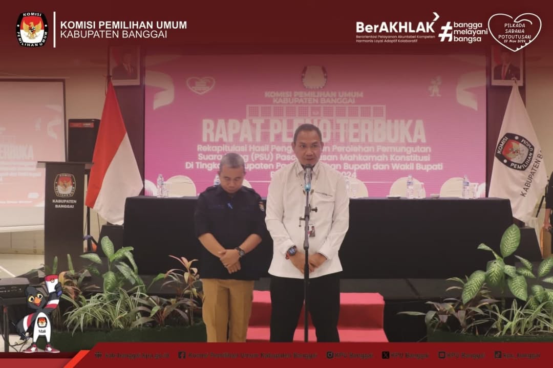 KPU Kabupaten Banggai melaksanakan Rapat Pleno Terbuka Rekapitulasi Hasil Penghitungan Perolehan Pemungutan Suara Ulang (PSU) Pasca Putusan Mahkamah Konstitusi di Tingkat Kabupaten pada Pemilihan Bupati dan Wakil Bupati Banggai Tahun 2024
