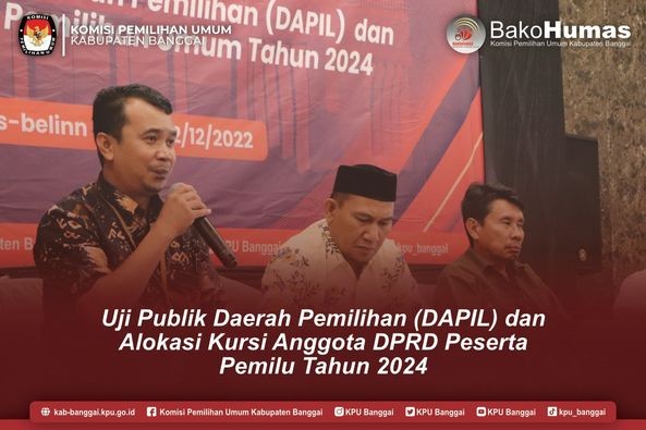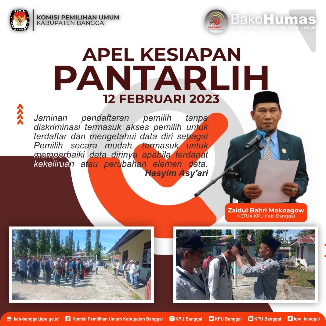 Komisi Pemilihan Umum Kabupaten Banggai melaksanakan Apel Kesiapan Pantarlih tersebar di 23 kecamatan, Pada kegiatan ini Pimpinan KPU Kabupaten berkesempatan menjadi Pembina Apel kesiapan pantarlih di 5 titik, untuk titik pertama kecamatan Luwuk dan Luwuk selatan dipusatkan diteluk lalong dan yg menjadi pembina apel adalah makmur dg manesa,Titik kedua dikecamatan toili pembina apel adalah ibu atriani, titik ketiga dikecamatan pagimana pembina apel adalah bapak Supriadi lawani,titik keempat dimasama , pembina apel adalah Alwin palalo dan ketua KPU kabupaten Banggai menjadi pembina apel kesiapan pantarlih dikecamatan balantak,