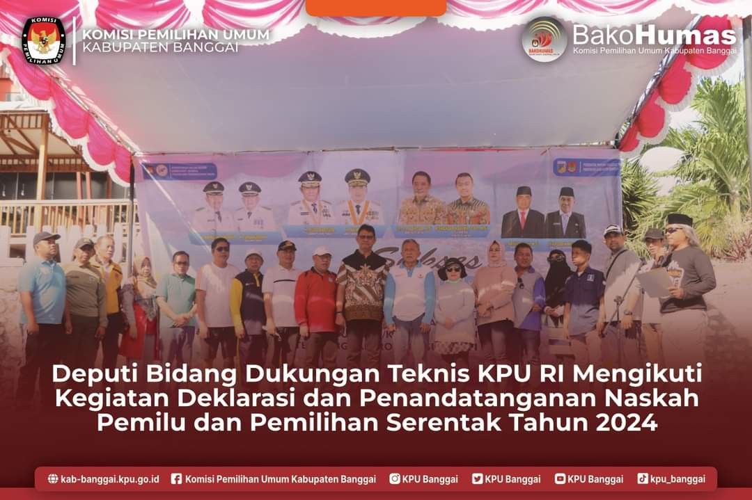 Badan Kesbangpol Se- Indonesia Gelar Deklarasi dan Penandatanganan Naskah Pemilu dan Pemilihan Serentak 2024 bertempat di Pantai Kilo 5 Luwuk. Setelah melaksanakan Rapat Koordinasi Nasional bersama Dirjen Polpum Kemendagri RI kemarin, Badan Kesatuan Bangsa Dan Politik se Indonesia menggelar deklarasi dan penandatanganan naskah Pemilu dan Pemilihan serentak 2024. Pada pukul 06.00 pagi untuk mengawali pertemuan besar tersebut, Badan Kesbangpol yang terdiri dari Kesbangpol Provinsi, Kabupaten/Kota seluruh Indonesia melakukan senam sehat bersama yang di laksanakan di area Ruang Terbuka Hijau Pantai Kilo Lima, Kecamatan Luwuk Selatan, Sabtu (17/09/22). Tak hanya Kesbangpol seluruh Indonesia, Bupati Banggai yang di wakili Wakil Bupati Banggai Drs. H. Furqan udin Masulili, Unsur Forkopimda, Sekab Banggai, Jajaran Kementerian Dalam Negeri RI, Jajaran Deputi Bawaslu, Jajaran Deputi KPU RI, Kepala OPD, BUMN/BUMD, Bupati dan Wakil Bupati Se Sulawesi Tengah, Pihak Hotel, Pengurus Partai Politik, Organisasi Kemasyarakatan, Tokoh Masyarakat, Camat dan Lurah Kabupaten Banggai ikut andil dalam pelaksanaan kegiatan. Usai melaksanakan penandatangan naskah deklarasi bersama, Wakil Bupati Banggai Drs. H. Furqanudin Masulili menyampaikan, dari pengamatan di lapangan tentang data, akhir-akhir ini adanya kecendrungan partisipasi aktif masyarakat dalam pemilu semakin rendah, dikarenakan data yang tidak akurat dan gencarnya kampanye golput yang teroganisir sehingga mempengaruhi masyarakat. "Pentingnya pemuktakhiran data ini, karena data pemilih berkelanjutan, bertujuan untuk memperbaharui data sehingga pelaksanaan tahapan Pemilu secara serentak di 2024 sukse, " Imbuhnya. Selanjutnya Wabup Furqan menjelaskan, Kami Pemerintah Kabupaten Banggai mendukung sepenuhnya jalannya Pemilu nanti, dan saat ini Pemerintah Daerah telah memfasilitasi pembentukan narahubung disetiap kecamatan di Kabupaten Banggai. " Hal ini tentu saja untuk membantu tugas-tugas KPU Kabupaten Banggai dalam memuktahirkan data pemilih, narahubung nantinya akan memberikan informasi terkait keadaan terkini data kependudukan di Wilayah Kecamatan masing-masing, dan dapat menetapkan daftar pemilih berkelanjutan di setiap bulan berjalan, "ucapnya. Sementara itu, Deputi Bidang Dukungan Teknis Komisi Pemilihan Umum (KPU) RI Mohamad Eberta Kawima pada kesempatannya mengatakan, Kami KPU RI sudah tentu tidak bisa bekerja sendiri, kami butuh dukungan serta kerjasama berbagai pihak dalam hal mensukseskan jalannya Pemilu Serentak di tahun 2024 nanti. Sebagai tahapan awalnya kami KPU RI telah melakukan persiapan. "Kami KPU RI sudah melakukan persiapan dimulai dari Lounching tahapan pelaksanaan Pemilihan Umum (Pemilu) pada tanggal 14 Juni tahun 2022, dan berlanjut nanti selesai Pemilu nanti 2024 dilaksanakan, setelah melewati proses pemungutan suara, kita juga akan melaksanakan rekapitulasi sampai ke tingkat pusat di bulan Maret, "ungkapnya. Tak hanya itu kata Muhamad, kami kedepan juga akan melayani sejumlah peserta Pemilu yang menyampaikan gugatan ataupun sengketa hasilnya ke Mahkamah Konstitusi (MK) dan di bulan Juni kita sudah mengumumkan dan menetapkan hasil Pemilihan dari Legislatif dan Capres serta Cawapres terpilih. Dalam rangkaian kegiatan tersebut, Wakil Bupati Banggai bersama dengan Anggota Legislatif dan sejumlah Parpol membacakan pernyataan sikap dan pengucapan ikrar untuk mensukseskan jalannya Pemilu serentak nanti.