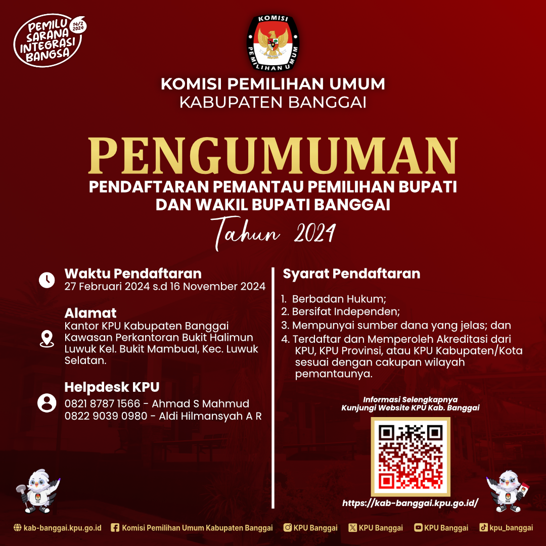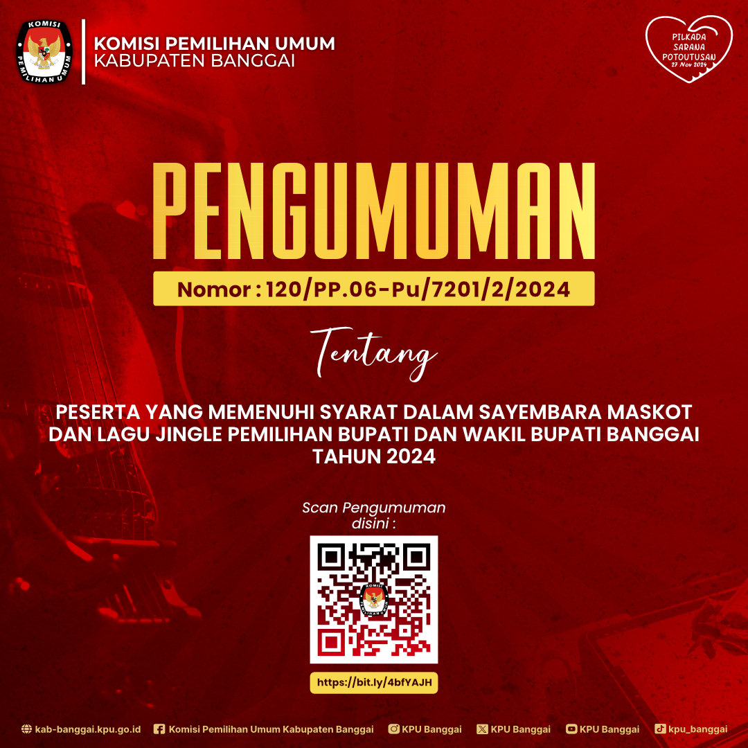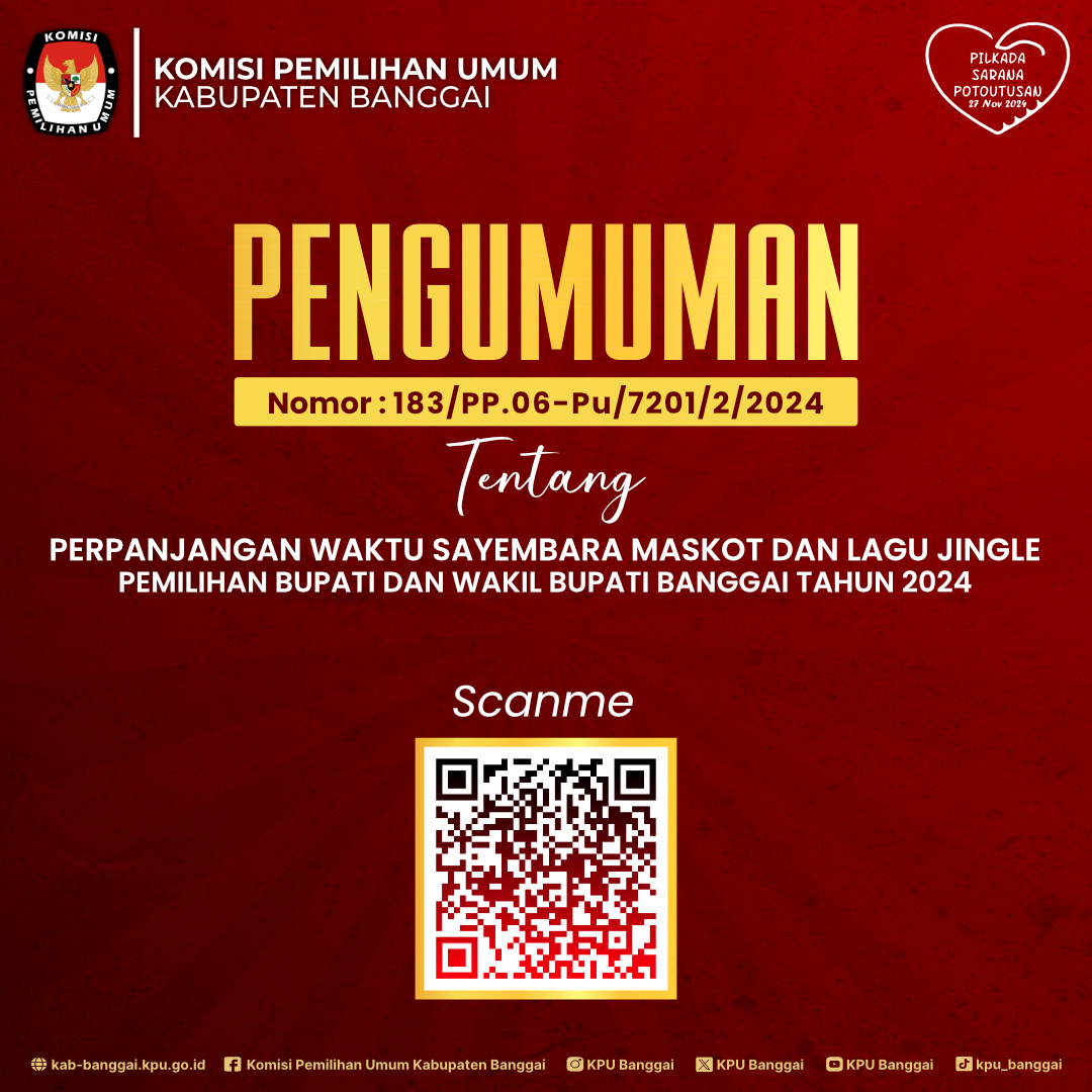 Ikuti Lomba Maskot dan Jingle Pemilihan Bupati dan Wakil Bupati Banggai Tahun 2024, syarat dan ketentuaan dapat discan barcode pada gambar dibawah ini, dan untuk informasi lebih lengkapnya bisa hubungi Contact Person :