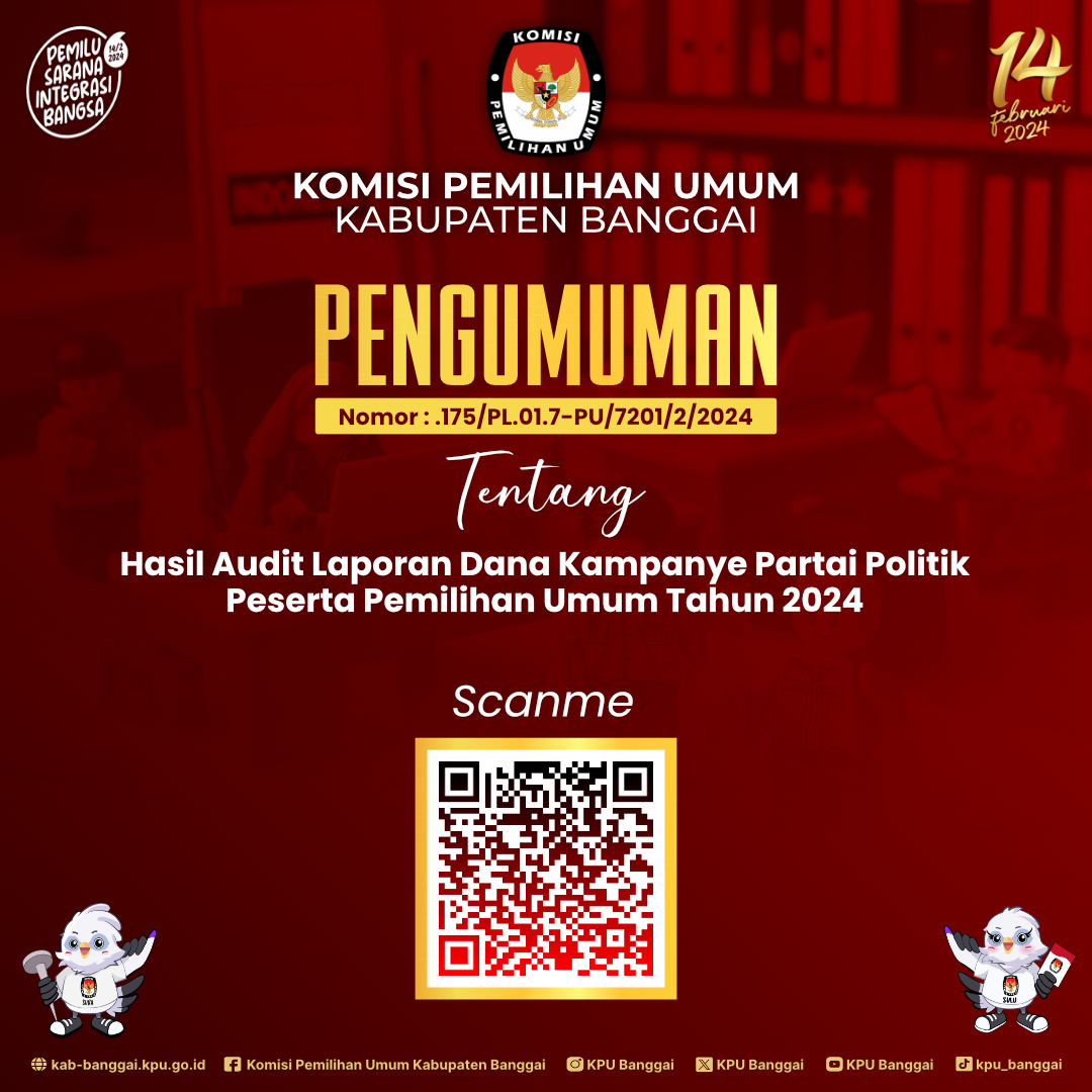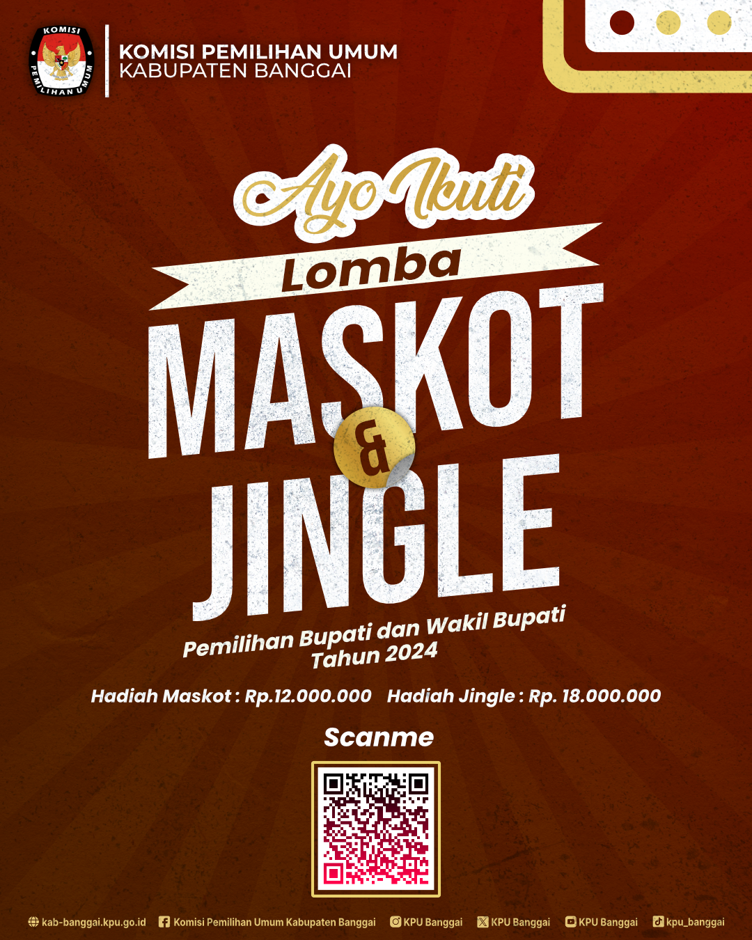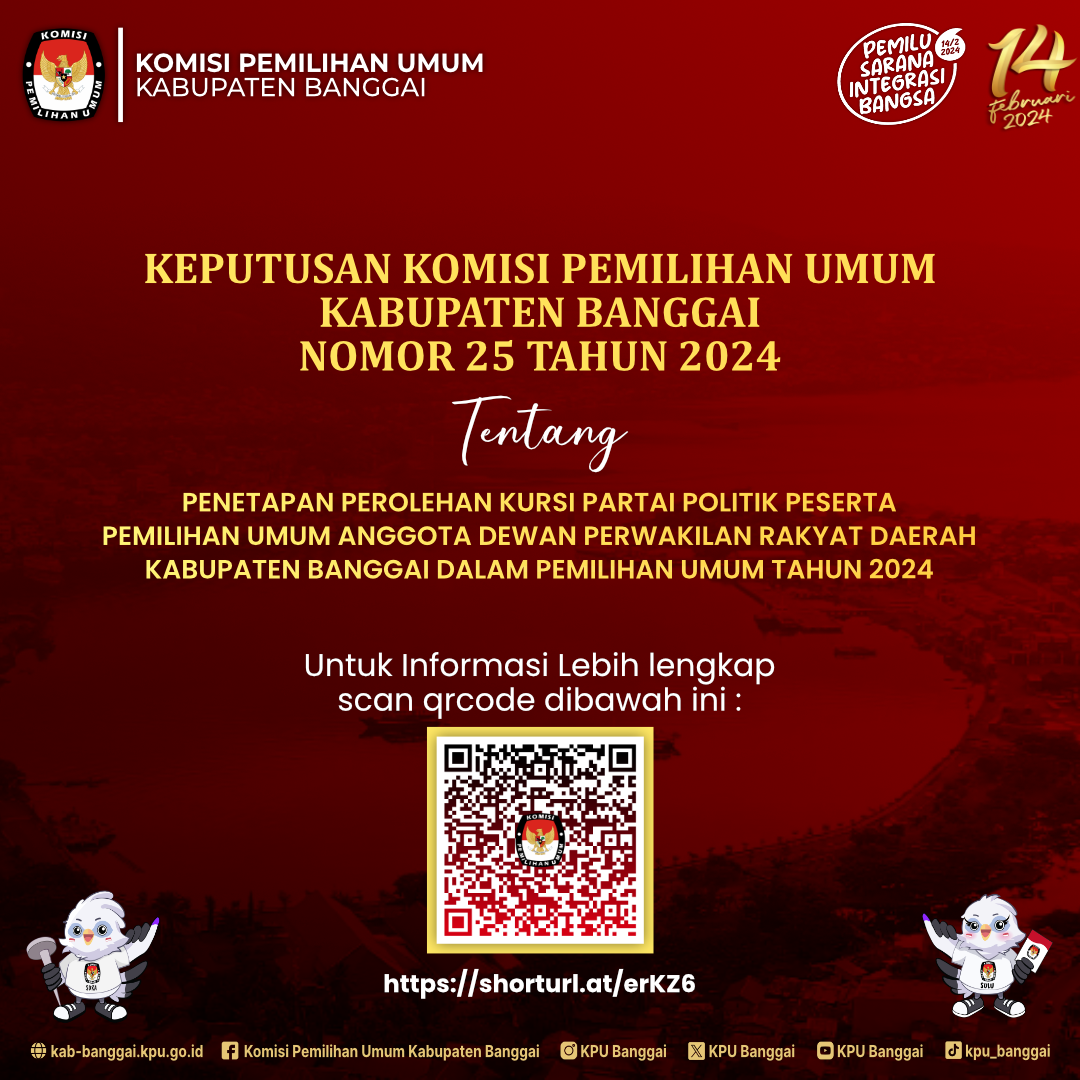 Ikuti Lomba Maskot dan Jingle Pemilihan Bupati dan Wakil Bupati Banggai Tahun 2024, syarat dan ketentuaan dapat discan barcode pada gambar dibawah ini, dan untuk informasi lebih lengkapnya bisa hubungi Contact Person :