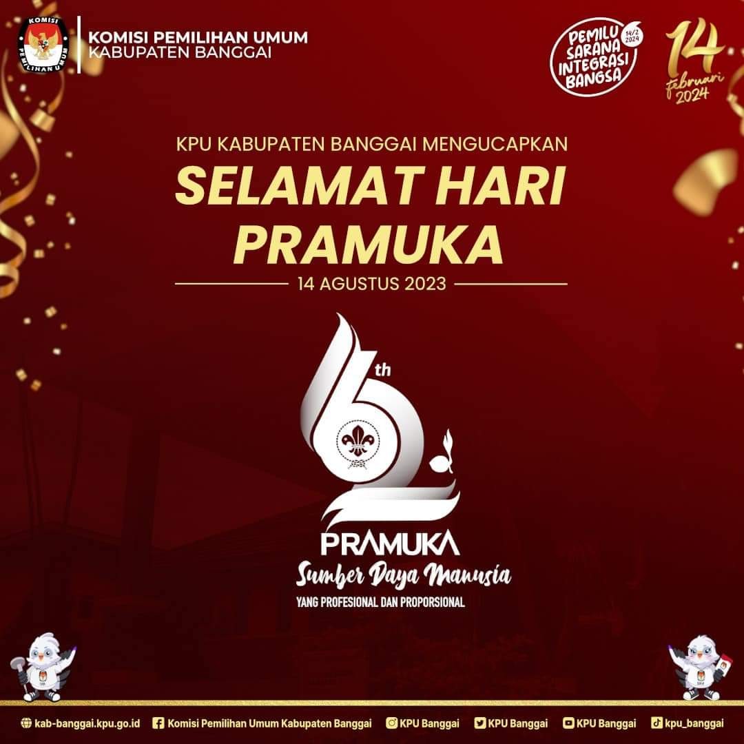 #TemanPemilih, KPU Kabupten Banggai mengucapkan Selamat Hari Pramuka ke 62 tanggal 14 Agustus 2023. Semoga Dasa Darma selalu menjadi Keutamaan bagi seluruh masyarakat, terutama generasi muda dan pemilih di Kabupaten Banggai