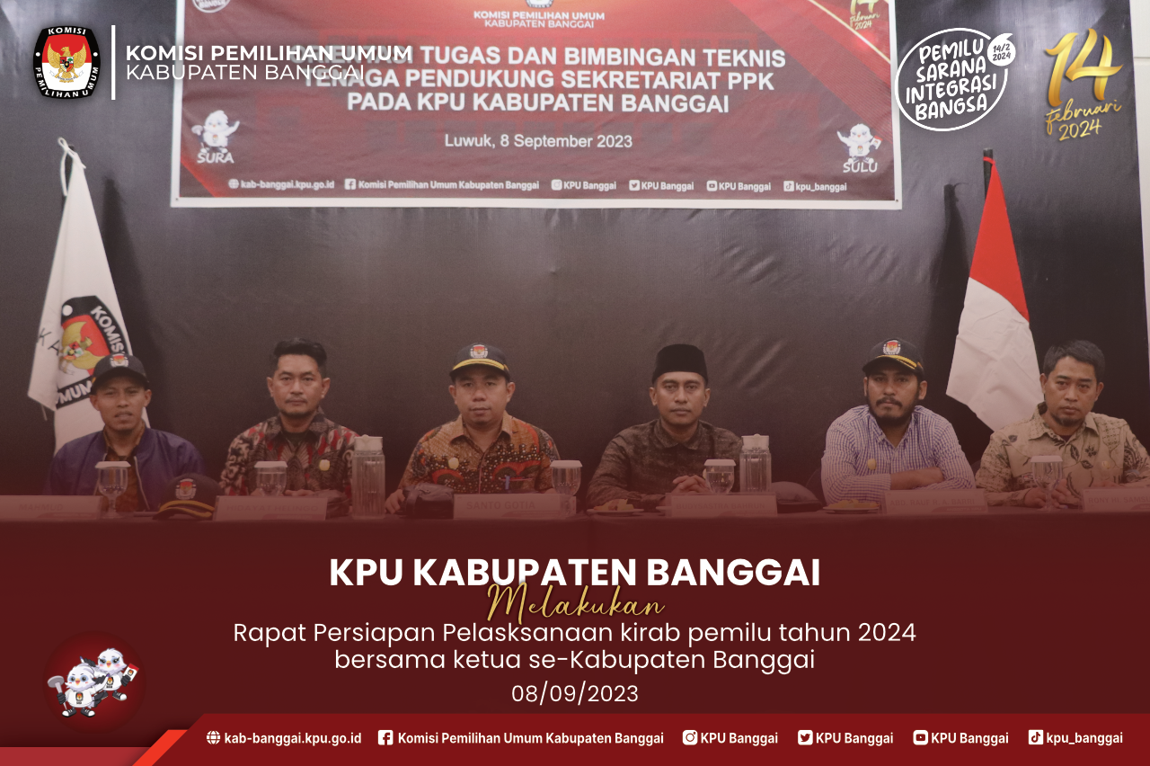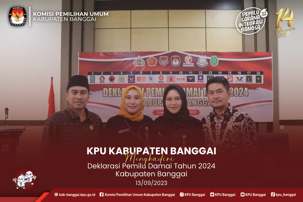 Komisi Pemilihan Umum (KPU) Kabupaten Banggai yang diwakili oleh Anggota KPU Kabupaten Banggai Hidayat Helingo dan Budysastra bahrun menghadiri undangan dari Polres Kabupaten Banggai dalam agenda Deklarasi Pemilu Damai di Kantor Polres Banggai pada hari rabu (13/09/2023). Turut Hadir sekretariat KPU Kabupaten Banggai Kepala subagian Teknis Penyelenggaraan Pemilu, Hubungan dan Partisipasi Masyarakat Syamsi Darni mendampingi anggota KPU Kabupaten Banggai yang hadir dalam undangan Tersebut. Kapolres Kabupaten Banggai AKBP Ade Nuramdani dalam sambutan untuk membuka kegiatan tersebut mengatakan bahwa Pemilu adalah momen penting dalam kehidupan demokrasi kita, dimana rakyat memiliki kesempatan untuk membuat pilihan yang akan membentuk masa depan negeri kita. Namun, penting bagi kita semua untuk menjalani proses ini dengan bertanggung jawab, menghormati nilai-nilai demokrasi, dan memastikan bahwa keamanan dan keharmonisan tetap terjaga. Hidayat Helingo mewakili Ketua KPU Kabupaten Banggai diberikan kesempatan untuk mengisi sambuatan dalam kegiatan tersebut mengatakan bahwa kampanye pemilu merupakan sarana pemersatu bangsa karena kita ketahui bersama definisi dari pemilu adalah merebut kekuasaan atau merebut kekuasaan dengan mengedepankan ketertiban dan keamanan. Menjelang akhir kegiatan tersebut diisi dengan pembacaan Deklarsi Pemilu Damai oleh Ketua DPRD Kabupaten Banggai yaitu Suprato dan diikuti oleh peserta yang hadir dalam kegitan tersebut antara lain KPU Kabupaten Banggai, Bawaslu Kabupaten Banggai, Sejumlah pimpinan atau perwakilan partai politik dan unsur Forkopimda. Akhir dari kegiatan ini adalah penandatanganan Deklarasi Pemilu Damai Tahun 2024 oleh peserta undangan yang hadir di kegitan tersebut. Tim Penulis - Hupmas KPU Kabupaten Banggai